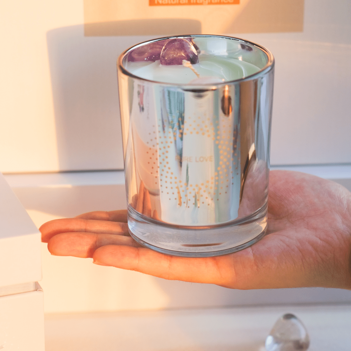 PURE LOVE offers soothing scents that infuse the air with a gentle, fruity sweetness while dispelling negativity. As well, the Amethyst within the candle activates your intuition- ideal for situations where you want to find the root of your anxiety, or simply want to dive into the world of your books.